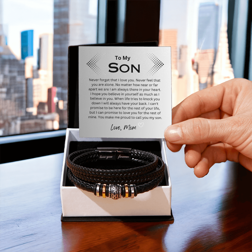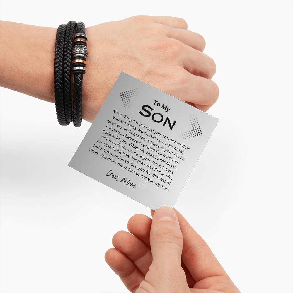 Let your Son know how much you love him and how proud you are to be his Mom with this unique men's bracelet. The card inside the box states: